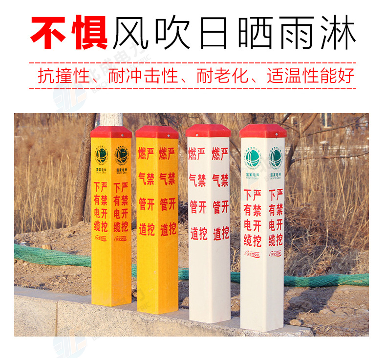 標志樁按用途分為: 電纜標志樁、油氣標志樁、通信標志樁、光纜標志樁、自來水標志樁、鐵路標志樁、公路里程樁。 性能指標: 1、拉伸強度≥160MPa 2、彎曲強度≥190MPa 3、浸水后彎曲強度≥150MPa 4、巴氏硬度≥38 5、環鋼度(5%)≥50KPa 6、熱變形溫度≥160℃ 7、氧指數26% 石家莊北成電力科技有限公司 聯系電話: 17603245663(微信同號) / 0311-67593878